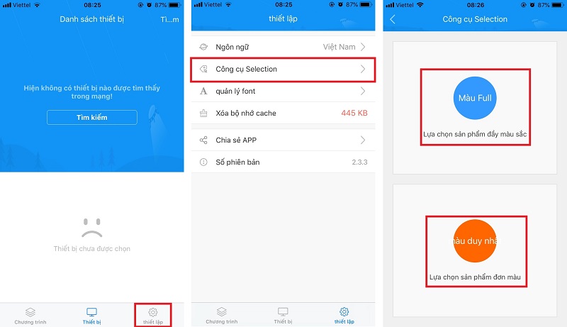 Sau khi tải và cài đặt trên điện thoại app LED ART điều khiển mạch HD wifi cho điện thoại các bạn thực hiện các bước lựa chọn như sau để Tra cứu mạch điều khiển HD phù hợp: