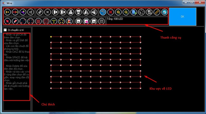Trên giao diện vẽ sơ đồ có thanh lựa chọn, khu vực ghi chú và hướng dẫn thao tác, với các công cụ làm việc như: Thêm bóng led, xóa bóng LED, Nối dây, Tạo sơ đồ có sẵn,...