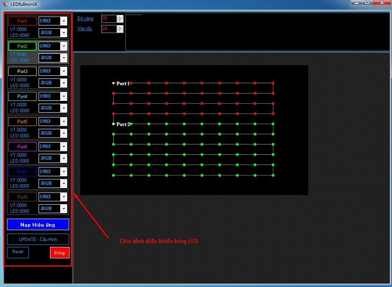 Đối với phiên bản mới nhất của phần mềm LED Fullmini X V3.2 kết hợp với các loại mạch điều khiển chuyên dụng các bạn hoàn toàn có thể làm chủ sơ đồ đấu nối, đi bóng LED bằng việc chia cổng kết nối.